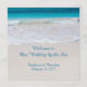Votos costeros, bienvenidos a nuestro boda junto al mar. Personalizar el texto impreso en la parte delantera de este programa casual de bodas en la playa. Bonito, agua tropical oceánica y arena suave es la imagen de fondo en ambos lados de este artículo con texto azul, guión.