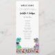 Programa divertido de boda con tema de dinosaurios con novios T-Rex coloridos en un hermoso prado de flores silvestres prehistóricas. Fácil de personalizar con los nombres de los novios, la fecha de la boda y todos los detalles de la ceremonia del día de la boda en tipografía moderna. Novios divertidos Tyrannosaurus Rex dino y ilustraciones de flores silvestres en acuarela en tonos azules, rosados, púrpuras, naranjas, amarillos, rojos y verdes. Arte floral y de dinosaurios original y único de la artista Catherine Sweetman.