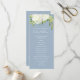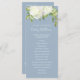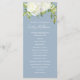 Un elegante programa de bodas floridas con un hermoso arreglo de flores y vegetación de peones blancos acuarelas. Se muestra con un color de fondo azul polvoriento que se puede personalizar para que coincida con el tema boda. Simplemente seleccione el botón "personalizar" para ver opciones de diseño adicionales.