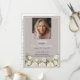 A beautiful and elegant folded funeral program adorned with simple elegant white roses.