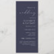 Este sencillo y elegante programa de bodas presenta texto blanco alineado con el margen derecho sobre un fondo azul marino oscuro. La palabra "boda" aparece en caligrafía de escritura a mano en blanco, con el texto restante en caracteres serif y cursiva.