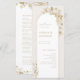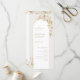 Estos elegantes y modernos programas de bodas cuentan con ilustraciones florales botánicos de oro falsos, que enmarcan una delicada línea dorada en forma de arco. Los detalles del evento aparecen en escritura romántica y en sofisticadas fuentes de serif. Ideal para una boda romántica en el jardín y un boda de lujo moderno. Vea todas las piezas coincidentes de la colección.
