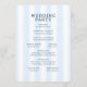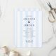 Este programa de boda presenta un diseño moderno y minimalista con un fondo azul claro adornado con rayas blancas verticales. El elegante texto azul marino está organizado en una jerarquía clara, destacando de manera prominente los detalles de la ceremonia y los nombres. Con líneas limpias y un amplio espacio negativo, este diseño emana sofisticación y tranquilidad, perfecto para una celebración de boda formal. Su diseño sencillo garantiza la legibilidad y mantiene un ambiente acogedor y sereno.