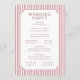 Este programa de boda presenta un elegante diseño rectangular con orientación vertical, enmarcado por franjas diagonales rosadas y blancas en los laterales. El área central muestra un fondo suave crema bordeado por un marco decorativo con esquinas ornamentadas, creando un aspecto clásico y sofisticado. El diseño utiliza una paleta de colores armoniosa de tonos rosados suaves, cremas y marrones intensos, que evocan calidez y tradición. La tipografía es clara y estructurada, con secciones personalizables para nombres, detalles de la ceremonia, fecha y ubicación, lo que la hace perfecta para personalizar. Ideal para bodas, este programa combina formalidad con un toque de encanto, estableciendo el tono para una celebración memorable.