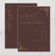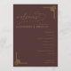 Este elegante programa de boda presenta un fondo marrón rico y profundo con acentos dorados que crean un ambiente lujoso y sofisticado. El diseño es vertical, mostrando una jerarquía equilibrada de elementos de texto que incluyen letra cursiva para el mensaje de bienvenida y fuentes serif limpias para los detalles de la ceremonia. Motivos geométricos decorativos en dorado añaden elegancia tradicional a las esquinas, realzando el estilo formal y clásico. Perfecto para una celebración atemporal, este diseño transmite calidez y formalidad, lo que lo hace ideal para eventos importantes de la vida como las bodas.