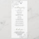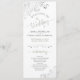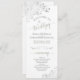 Este hermoso programa de bodas presenta un diseño elegante con texto verde sabio y gris sobre un fondo blanco y rizos de Relieve metalizado gris plateado y remolinos en las esquinas. Los títulos están escritos en sofisticada caligrafía de escritura, y hay espacio para tu ceremonia y detalles de la fiesta de boda, así como un breve agradecimiento para tus invitados. Una forma maravillosa de dar la bienvenida a sus amigos y familiares a la celebración de su boda.