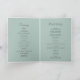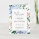 Este elegante programa de bodas plegadas blancas hidrangea azul es perfecto para un boda de primavera o verano. El diseño floral clásico presenta hidrangeas de color azul en polvo suave acentuadas con flores rosas neutras y hojas verdes.