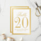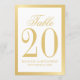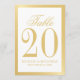Elegante Tarjeta de número de tabla de boda incluye el título "Tabla" en estilo de tipo de letra y número de tabla de guión elegante dorado, detalles bodas en estilo de tipo de letra de serif dorado con borde dorado sobre fondo blanco. También es perfecto para una ducha de novias, una cena de ensayo, una fiesta de cumpleaños, restaurantes, fiestas y eventos especiales. Nota: Los detalles del Relieve metalizado se simulan en la obra de arte. Este producto no contará con ningún relieve ni capa que creen un efecto metalizado.