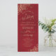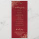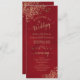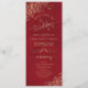 Este hermoso programa de bodas presenta un diseño elegante con texto dorado sobre un fondo rojo oscuro y rizos de Relieve metalizado dorados anacrónicos y remolinos en las esquinas. Los títulos están escritos en sofisticada caligrafía de escritura, y hay espacio para tu ceremonia y detalles de la fiesta de boda, así como un breve agradecimiento para tus invitados. Una forma maravillosa de dar la bienvenida a sus amigos y familiares a la celebración de su boda.