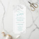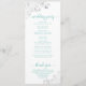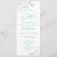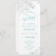 Este hermoso programa de bodas presenta un diseño elegante con texto de color verde azulado claro o acuático sobre un fondo blanco y flamencos de Relieve metalizado gris plateado y remolinos en las esquinas. Los títulos están escritos en sofisticada caligrafía de escritura, y hay espacio para tu ceremonia y detalles de la fiesta de boda, así como un breve agradecimiento para tus invitados. Una forma maravillosa de dar la bienvenida a sus amigos y familiares a la celebración de su boda.