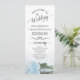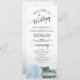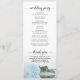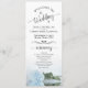 Este hermoso programa de bodas presenta un diseño elegante con un único rosa de color azul o azul polvoriento, de tallo largo, sobre su lado reflejado en el agua. Los títulos están escritos en sofisticada caligrafía de escritura, y hay espacio para tu ceremonia y detalles de la fiesta de boda, así como un breve agradecimiento para tus invitados. Una forma maravillosa de dar la bienvenida a sus amigos y familiares a la celebración de su boda.