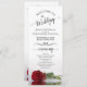 Este hermoso programa de bodas presenta un diseño elegante con una sola rosa roja de tallo largo sobre su lado reflejando en el agua. Los títulos están escritos en sofisticada caligrafía de escritura, y hay espacio para tu ceremonia y detalles de la fiesta de boda, así como un breve agradecimiento para tus invitados. Una forma maravillosa de dar la bienvenida a sus amigos y familiares a la celebración de su boda.
