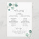 Elegante programa de bodas con un diseño sencillo, con una vegetación de eucalipto verde salado pintado de color agua en la esquina superior izquierda y en la esquina inferior derecha. La parte delantera tiene tu orden de ceremonia y la parte trasera tiene tu fiesta de boda y mensaje de agradecimiento. Estos rústicos programas de bodas botánicas con un toque moderno son perfectos para un boda de primavera o verano.