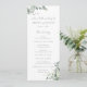 Este diseño botánico único cuenta con una rama curvada de elegantes hojas de eucalipto acuarela con hojas reseñadas de plata artística y flores silvestres blancas.