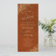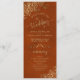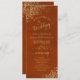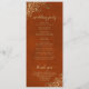 Este hermoso programa de bodas presenta un diseño elegante con texto dorado sobre un naranja rojizo o fondo de color madera quemada y flamencos dorados de Relieve metalizado y remolinos en las esquinas. Los títulos están escritos en sofisticada caligrafía de escritura, y hay espacio para tu ceremonia y detalles de la fiesta de boda, así como un breve agradecimiento para tus invitados. Una forma maravillosa de dar la bienvenida a sus amigos y familiares a la celebración de su boda.