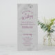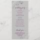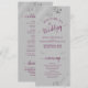Este hermoso programa de boda cuenta con un diseño elegante con texto de cassis púrpura o magenta sobre un fondo gris y rizos y espirales de falso foil gris plateado en las esquinas. Los títulos están escritos en caligrafía de guión elegante, y hay espacio para los detalles de su ceremonia y cortejo nupcial, así como un breve agradecimiento para sus invitados. Una forma maravillosa de dar la bienvenida a amigos y familiares a su celebración de boda.