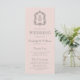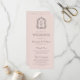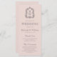 Este elegante programa de bodas de inspiración vintage presenta un par de iniciales en monograma gris carbón en tipo serif abierto por encima y debajo de una línea divisoria y rodeado por un escudo botánico de arte lineal con un fondo rosa rubor.