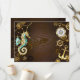 Fondo de madera marrón con mar, cresta mecánica, volante antiguo, ancla dorada y varios engranajes de oro y latón. Estilo Steampunk.