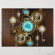 Lentes turquesa con un reloj de antigüedades con engranajes de latón y llaves doradas sobre un fondo oxidado y marrón. Estilo Steampunk.