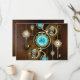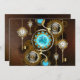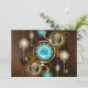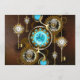 Lentes turquesa con un reloj de antigüedades con engranajes de latón y llaves doradas sobre un fondo oxidado y marrón. Estilo Steampunk.
