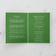 Programa funerario con temática irlandesa plegado en colores tradicionales irlandeses, blanco y verde, con tréboles de chamrock dispersos para la decoración. En la portada, una fotografía de tu ser querido junto con su nombre, años de vida y hora y fecha de servicio. Dentro puede escribir el programa obituario y el orden de servicio. La parte posterior del programa queda para que añadas reconocimientos a tus amigos y familiares.