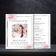 Un elegante programa de 2 páginas. Fondo blanco, marco falso plateado, florales rosas y blancas y espacio para una foto. Personalice y agregue el nombre, las fechas y el texto.