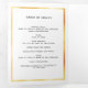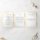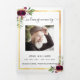 Un elegante programa triple. Un fondo blanco, un marco falso dorado, flores de borgoña y espacio para tu foto. Personalice y agregue el nombre, las fechas y el texto.