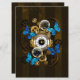 Composición de reloj de vapor redondo con dial numérico romano negro, decorado con arcos de oro y latón, mariposas morfo azules y lentes dañadas sobre fondo rayado marrón. Estilo Steampunk.