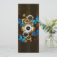 Composición de reloj de vapor redondo con dial numérico romano negro, decorado con arcos de oro y latón, mariposas morfo azules y lentes dañadas sobre fondo rayado marrón. Estilo Steampunk.