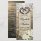 Rústico estilo de campo Boda Programa de Rústica Cartas para rack - Pareja Corazón de herradura vieja con nudo de abatimiento y encaje blanco, Flor de hidrangea, Luces de cuerdas y tela de arpillera sobre fondo de madera de antiguo granero. Un diseño perfecto para tu gran día. ¡Todo el estilo de texto, colores, tamaños se pueden modificar para adaptarlo a sus necesidades!