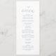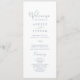 Este mínimo programa de bodas azul polvoriento de hojas es perfecto para una boda elegante. El diseño presenta una sencilla silueta verde de pizarra clara azul con un estilo minimalista clásico. Incluya el nombre de la novia y el novio, la fecha y ubicación del boda, el mensaje de agradecimiento, el orden de servicio, la fiesta de novias y un monumento opcional "en memoria amorosa".