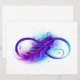Símbolo de infinito con una hermosa pluma pintada en colores brillantes púrpura y azul sobre fondo blanco.
