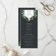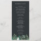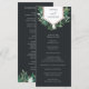 Elegante programa de boda botánico que presenta los detalles de su ceremonia coronada por un elemento geométrico de falso foil de cobre adornado con follaje de acuarela verde y pequeñas flores blancas, con sus nombres dentro. El reverso enumera a los miembros de su fiesta de bodas con campos de texto fácilmente editables en blanco sobre un fondo oscuro intenso y negro. Se coordina con nuestra colección de invitaciones de boda Greenhouse. Utilice los campos de plantilla para agregar la información de la ceremonia y del séquito nupcial, y luego haga clic en "Personalizar" para reposicionar los elementos si es necesario.
