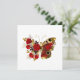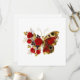 Mariposa de flores de los ojos de pavo real rojo con ala texturada roja, decorada con rosas rojos, pintados artistalmente con tallo dorado y hojas sobre fondo blanco.