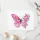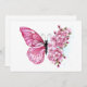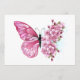 Arreglo floral de mariposa rosa con flores japonesas de cerezo rosadas sobre fondo blanco.