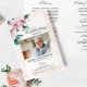 Programa conmemorativo funerario que presenta en la parte delantera una foto del fallecido, su nombre, fechas, el lugar conmemorativo, fecha del evento, y un elegante marco dorado con rosas blancas acuarelas. En el interior hay un obituario, y orden de servicio; y en el fondo otra foto, una nota de agradecimiento y el segundo lugar para después del funeral. NOTA: Estos vienen como un papel plano de calidad, necesitarás doblarlos tú mismo.
