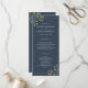 Elegante programa de bodas con un diseño botánico de eucalipto sobre un fondo azul marino oscuro de moda. Simplemente agregue los detalles del programa de boda. Si necesita ayuda o productos que coincidan, por favor contáctenos a través de nuestra tienda. ¡Estamos encantados de ayudarle a hacer de su boda el día más hermoso!