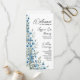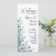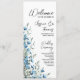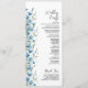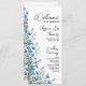 Bienvenido a su ceremonia de boda con este programa rústico de bodas de flores silvestres. Cuenta con un abundante lino azul o flores peringuiles sobre un fondo blanco clásico. Los títulos están escritos con elegantes letras de guión y hay espacio para los detalles de la ceremonia, boda o fiesta de novias, y una breve nota de agradecimiento. El texto justificado a la derecha le da al programa una apariencia única y moderna.