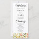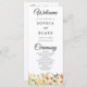 Presentamos nuestro elegante programa de bodas, con un impresionante jardín de flores y vegetación naranjas, amarillas y azules que se centra bellamente en la parte inferior del programa. Este diseño es perfecto para los que desean algo sencillo, pero de diseño y de inspiración botánica. En la parte delantera del programa encontrarás los nombres de la pareja, la fecha boda, la ciudad y el estado, así como la orden de la ceremonia. La información se muestra en un simple tipo de letra en negro, mientras que las palabras "Bienvenidos", "Ceremonia" y "Fiesta de la Boda" se escriben en un precioso tipo de letra negro moderno, añadiendo un toque de sofisticación al diseño. Al fondo del programa, encontrarás una lista de la fiesta de bodas, completando el diseño completo e informativo. Los nombres de la pareja se resaltan en un audaz tipo de letra negro simple con espacio entre letras para que destaquen, añadiendo un toque de elegancia adicional a este encantador programa. En general, este programa de bodas es un placer hermoso y funcional para tu día especial que tus invitados apreciarán. Su diseño elegante y su atención a los detalles lo convierten en una elección perfecta para las parejas que desean añadir un toque botánico a su ceremonia boda.