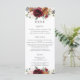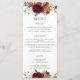 Diseñado para coordinar con nuestra colección de bodas de Blooms Rústicos, este elegante menú nupcial presenta una hermosa acuarela de color burdeos, naranja quemado, rosas blancas de marfil, hortensias, existencias y disposición de vegetación. Personalízalo con los detalles de su boda fácil y rápidamente, simplemente pulse el botón personalizar para reorganizar y formatear el estilo y la ubicación del texto. Doble cara. El estudio del gato feliz