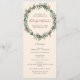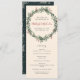 ¡Celebra tu boda de invierno con estos programas temáticos de Navidades festivos! Con una corona acuarela con bayas huecas colocadas sobre un fondo suave de durazno que muestra sus nombres. Los detalles de su boda se muestran en una tipografía sencilla y moderna. Esta invitación se revierte a un fondo verde oscuro que contrasta el frente con un patrón de copos de nieve dibujados a mano alrededor de los bordes.
