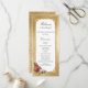 Crea una inolvidable boda de invierno con este elegante diseño de programa vacacional con un exuberante spray de Navidades rosas, poinsettia, holly y pino, etiqueta blanca con un borde dorado ornamental y un opulento fondo de damasco de gradiente de oro metálico falso.