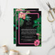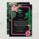 Una moderna pero retro temática neón rosado botánico sobre fondo negro. Un bonito diseño boda ideal para el verano. Diseño perfecto de plantas tropicales de neón rosa con palmeras, flores rosadas de Hibiscus y flores Plumerias Frangipanis. Los colores negro, rosa y verde dominan este diseño de neón rosa tropical. La moderna tipografía caligráfica contrasta perfectamente con el diseño de temática boda negro y rosa. Elegante diseño elegante de tarjetas de programa itinerario de bodas con elementos modernos y sencillos. También están disponibles artículos de papelería para bodas y otros formatos de invitación para bodas.