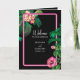 Una moderna pero retro temática neón rosado botánico sobre fondo negro. Un bonito diseño boda ideal para el verano. Diseño perfecto de plantas tropicales de neón rosa con palmeras, flores rosadas de Hibiscus y flores Plumerias Frangipanis. Los colores negro, rosa y verde dominan este diseño de neón rosa tropical. La moderna tipografía caligráfica contrasta perfectamente con el diseño de temática boda negro y rosa. Elegante diseño de programa de boda con detalles modernos y sencillos. También están disponibles artículos de papelería para bodas y otros formatos de invitación para bodas.
