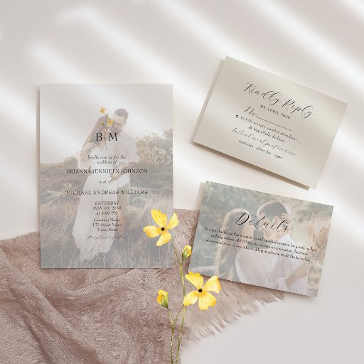 Celebrate your special day with this elegant two-sided wedding program featuring your favorite photos beneath soft overlays, a delicate wildflower monogram, and minimalist typography. The front lists your ceremony details, while the back highlights your wedding party and thank-you message. Perfect for couples who love a modern, romantic, and nature-inspired look in timeless ivory and gold tones.