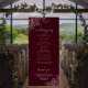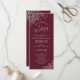 Este hermoso programa de bodas presenta un diseño elegante con un texto gris pálido sobre un fondo borgoñón y flamencos de Relieve metalizado gris plateado y remolinos en las esquinas. Los títulos están escritos en sofisticada caligrafía de escritura, y hay espacio para tu ceremonia y detalles de la fiesta de boda, así como un breve agradecimiento por tu invitado. Una forma maravillosa de dar la bienvenida a sus amigos y familiares a la celebración de su boda.