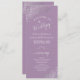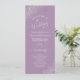 Este hermoso programa de bodas presenta un diseño elegante con texto blanco sobre un fondo polvoriento morado o lavanda y flamencos de Relieve metalizado gris plateado y remolinos en las esquinas. Los títulos están escritos en sofisticada caligrafía de escritura, y hay espacio para tu ceremonia y detalles de la fiesta de boda, así como un breve agradecimiento por tu invitado. Una forma maravillosa de dar la bienvenida a sus amigos y familiares a la celebración de su boda.