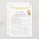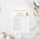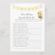 Un juego divertido para la ducha de bebé es el juego de ¿Quién conoce a papá? Este juego tiene un cartel amarillo en la parte superior y un oso de peluche con una abeja. Al revés hay un oso de peluche que se apoya en un barril de miel mirando una abeja con plantillas.