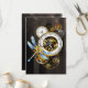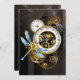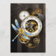 Diales antiguos con artes de oro y latón, decorados con libélula mecánica sobre fondo marrón, rayado. Steampunk.