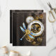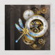 Diales antiguos con artes de oro y latón, decorados con libélula mecánica sobre fondo marrón, rayado. Steampunk.